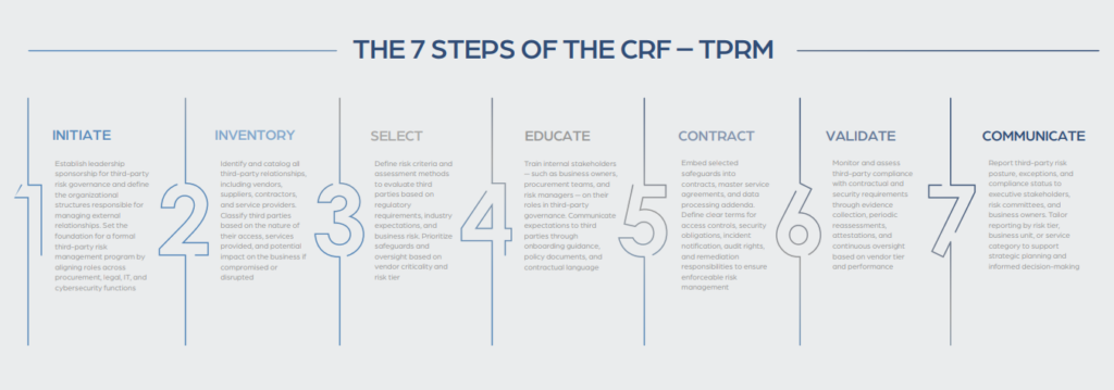 The CRF Third-Party Risk Model (CRF-TPRM) is a standalone whitepaper that defines a structured, seven-step approach to governing cybersecurity risk across third-party relationships. It is not a maturity model, risk scoring system, or assurance framework — its role is to ensure that third-party risk is managed deliberately, consistently, and in alignment with business objectives.